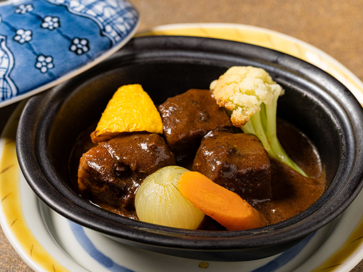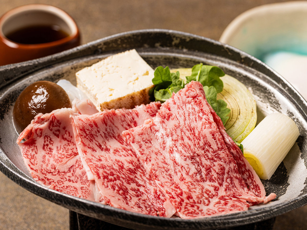 猪肉のシチュー、鮑の踊り焼き、金目鯛の揚げ出し、遠州夢咲牛のすき焼きと4種類のメインはどれも絶品です。