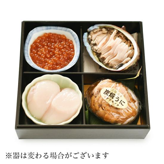 コリコリとした歯ごたえと磯の香りが楽しめるアワビの高級食材4種が盛り付けられた まるで宝石箱のような超贅沢な重箱です。
